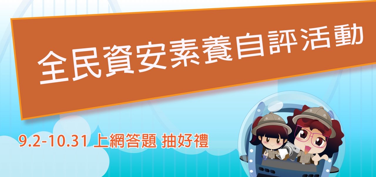 為提升師生資安素養與電腦防護能力,該部自9月2日至10月31日舉辦「全民資安素養自我評量」活動,敬請協助將banner電子檔置於貴校網站上,並連結該活動網站(網址:https:/isafeevent.moe.edu.tw/),以鼓勵師生於活動期間內踴躍上網觀看動畫教材及檢測資訊安全素養認知程度,並有機會參與抽獎。