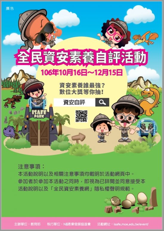 二、為提升全民資安素養與電腦防護能力,教育部於106年10月16日至12月15日辦理「全民資安素養自我評量」活動,請鼓勵師生於活動期間內踴躍上網觀看動畫教材及檢測資訊安全素養認知程度,並有機會參與抽獎,詳情請參閱活動網站(https://isafe.moe.edu.tw/event)。