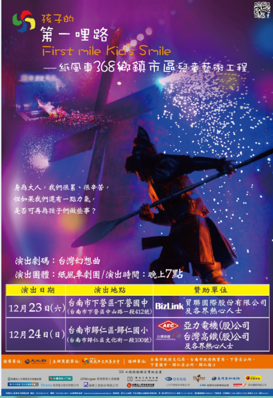 紙風車劇團將於106年12月23日(星期六)晚上7點,於下營國中演出「台灣幻想曲」,活動詳情如附件所示。