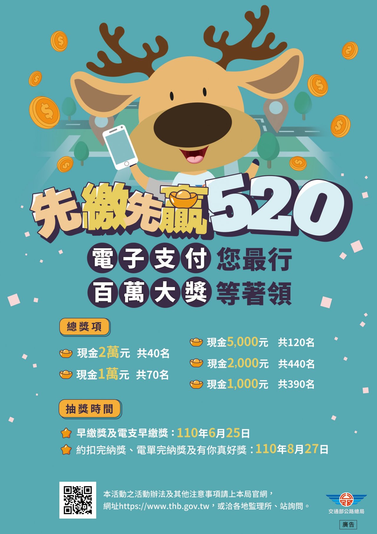 二、交通部公路總局為配合政府推動電子化支付政策,營造「線下(臨櫃)至線上(網路)」數位經濟環境,今年賡續推出110年「汽燃費先繳先贏-電子支付您最行,百萬大獎等著領」提前繳納汽燃費抽獎活動,自用汽車及機車車主只要在5月20日前(非因申請牌照或車輛異動)先行繳納110年度汽燃費,或在指定日期前申辦委託轉帳代繳汽燃費或汽燃費電子繳款單並繳清,就有1,060個獎項、總計337萬的獎金可以抽獎。