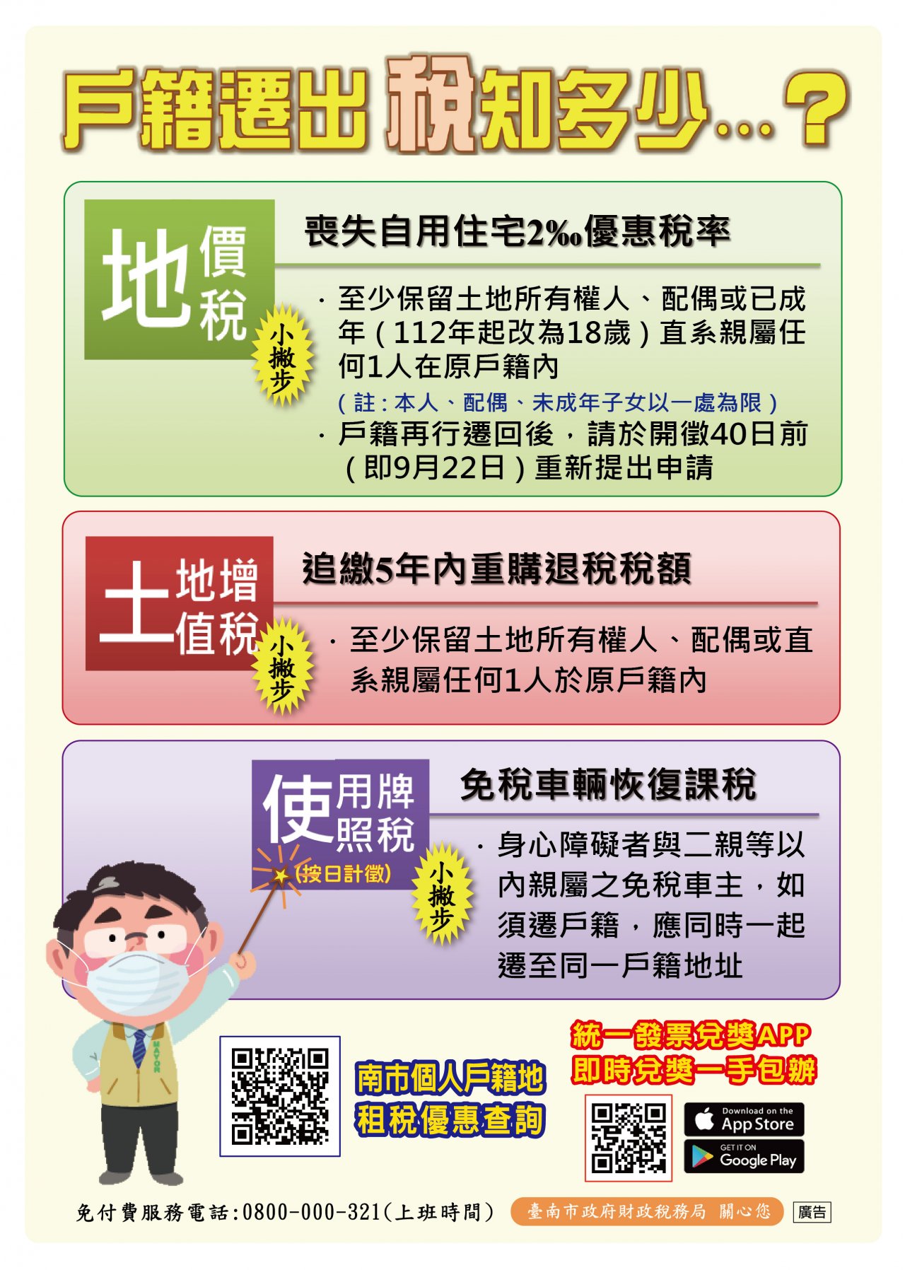 一、宣導內容:為方便民眾能即時查得目前戶籍地所享有之租稅優惠,於戶籍遷出前能審慎評估,避免因戶籍遷移而被追繳稅金,臺南市政府財政稅務局創新開發線上「南市個人戶籍地租稅優惠查詢」服務,請多加運用。