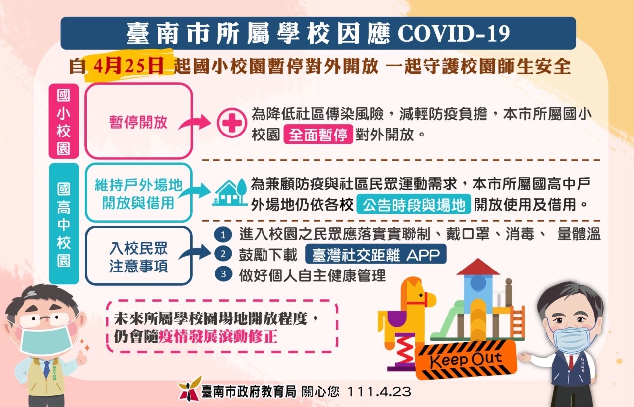 國小校園暫停開放:因國小學生尚未施打疫苗,為降低社區傳染風險、減輕學校防疫負擔,市屬國小校園全面暫停對外開放。
