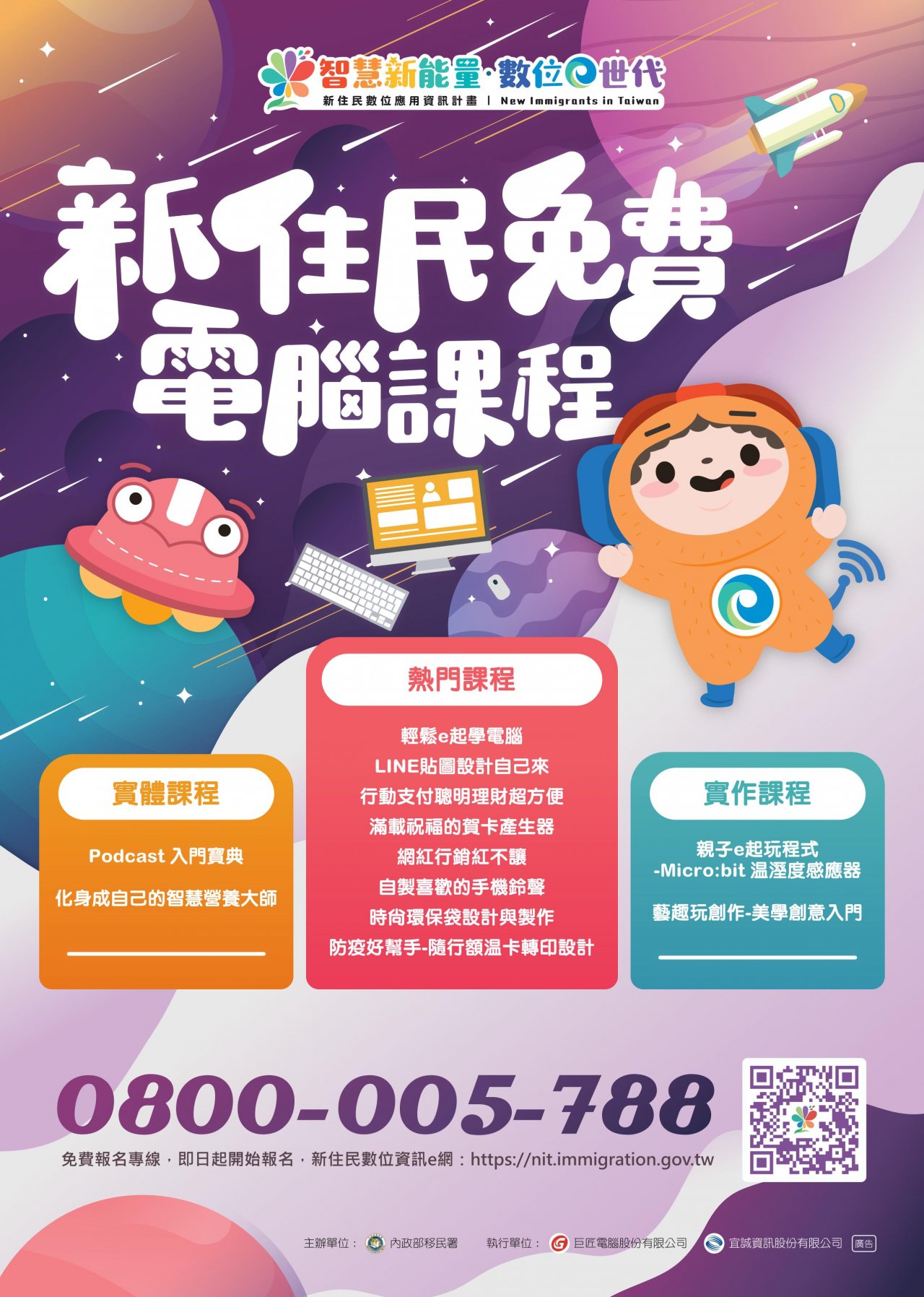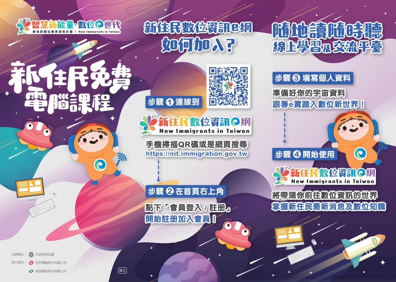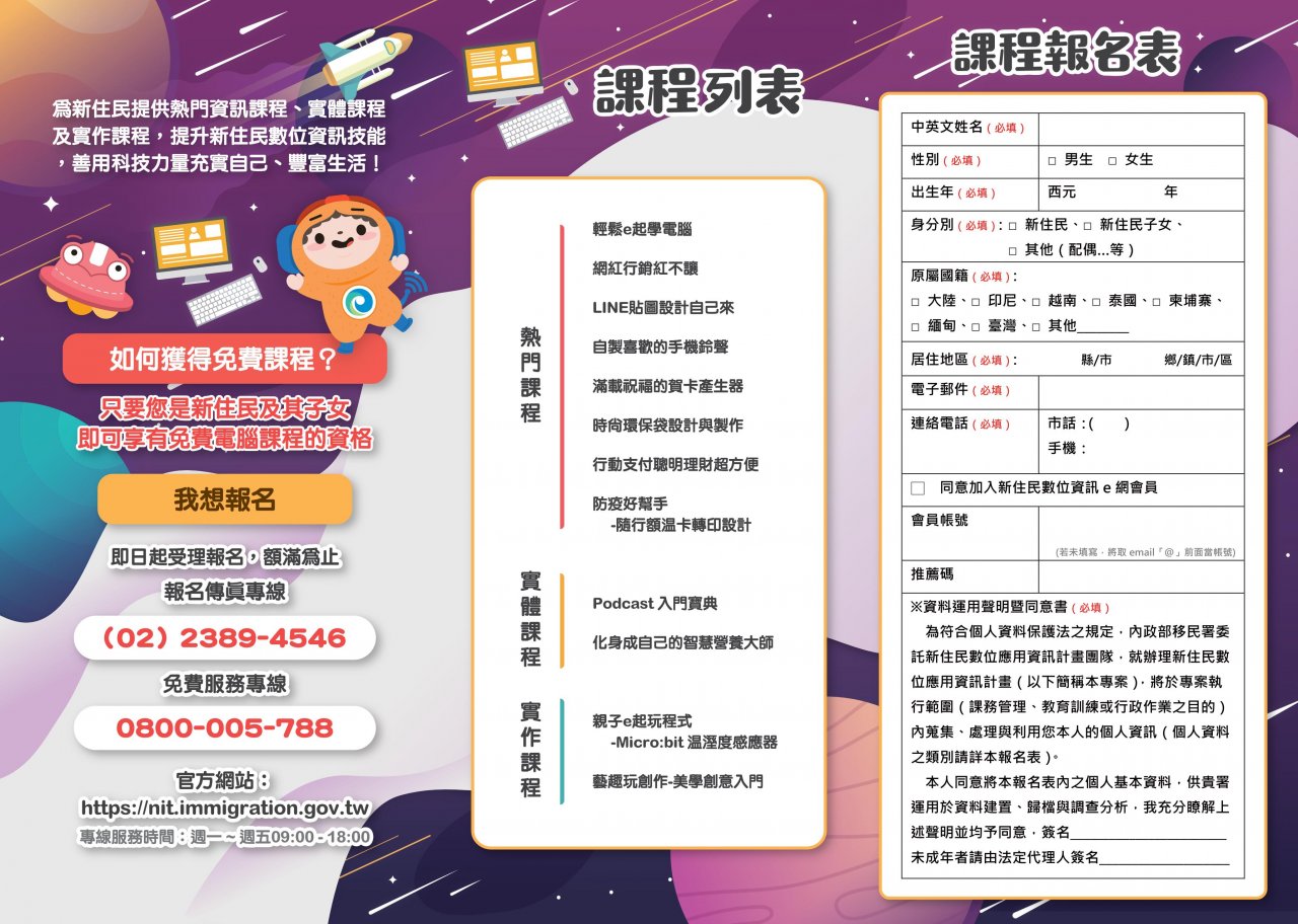 二、檢附上開來函、相關宣傳海報及摺頁報名表,或至「新住民數位資訊e網」查詢(https://nit.immigration.gov.tw/)。