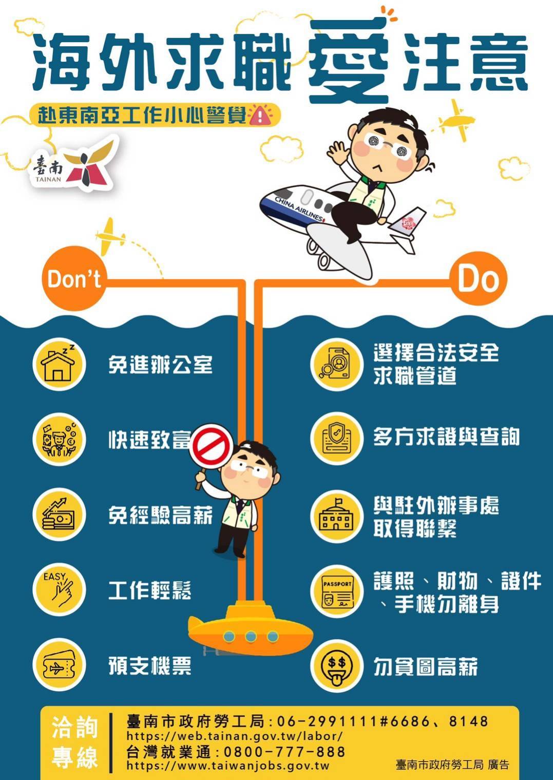 近期東南亞國家(如柬埔寨等)犯罪集團主打以簡單的工作、不需要經驗、包吃包住、待遇優渥等誘因詐騙我國青年赴當地短期打工,入境後限制其人身自由、侵害人權等行徑,加以當地環境複雜、公權力執法不彰或位處邊境等因素,大幅影響救援難度,內政部警政署與YouTube透過影音創作者製作宣導影片(https://www.youtube.com/playlist?list=PLPh89N96p446xYrBcHdSVhpG4pHNGkdSM),提供各單位進行宣導。