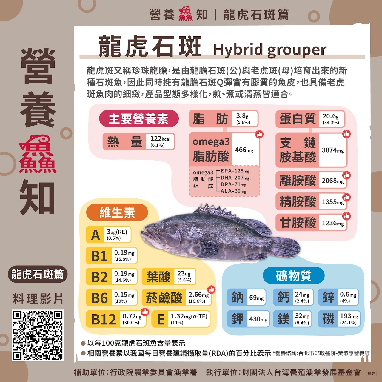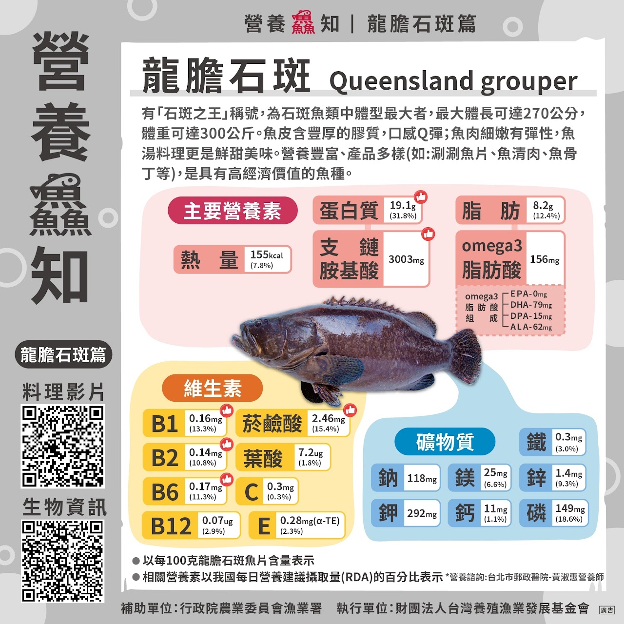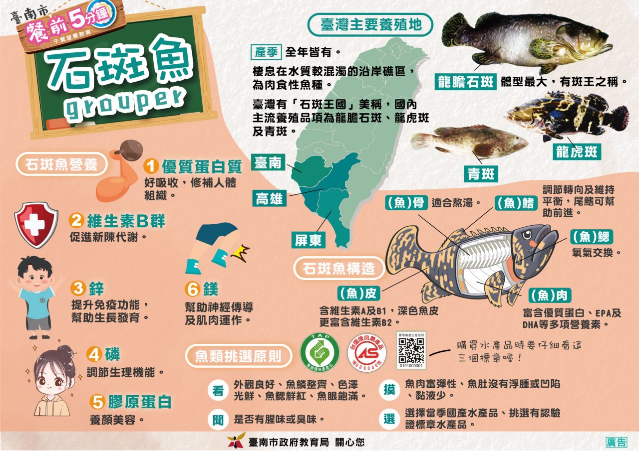 一、本市為響應行政院農業委員會與教育部推動之「班班吃石斑」計畫,從11月1日起全面供應石斑魚予本市所屬各國中、小作為營養午餐加菜,本學期共計4次,為推廣石斑魚等食魚教育及國產可溯源水產品,本局特製石斑魚主題海報,說明石斑魚的結構、營養成份及魚類挑選原則。