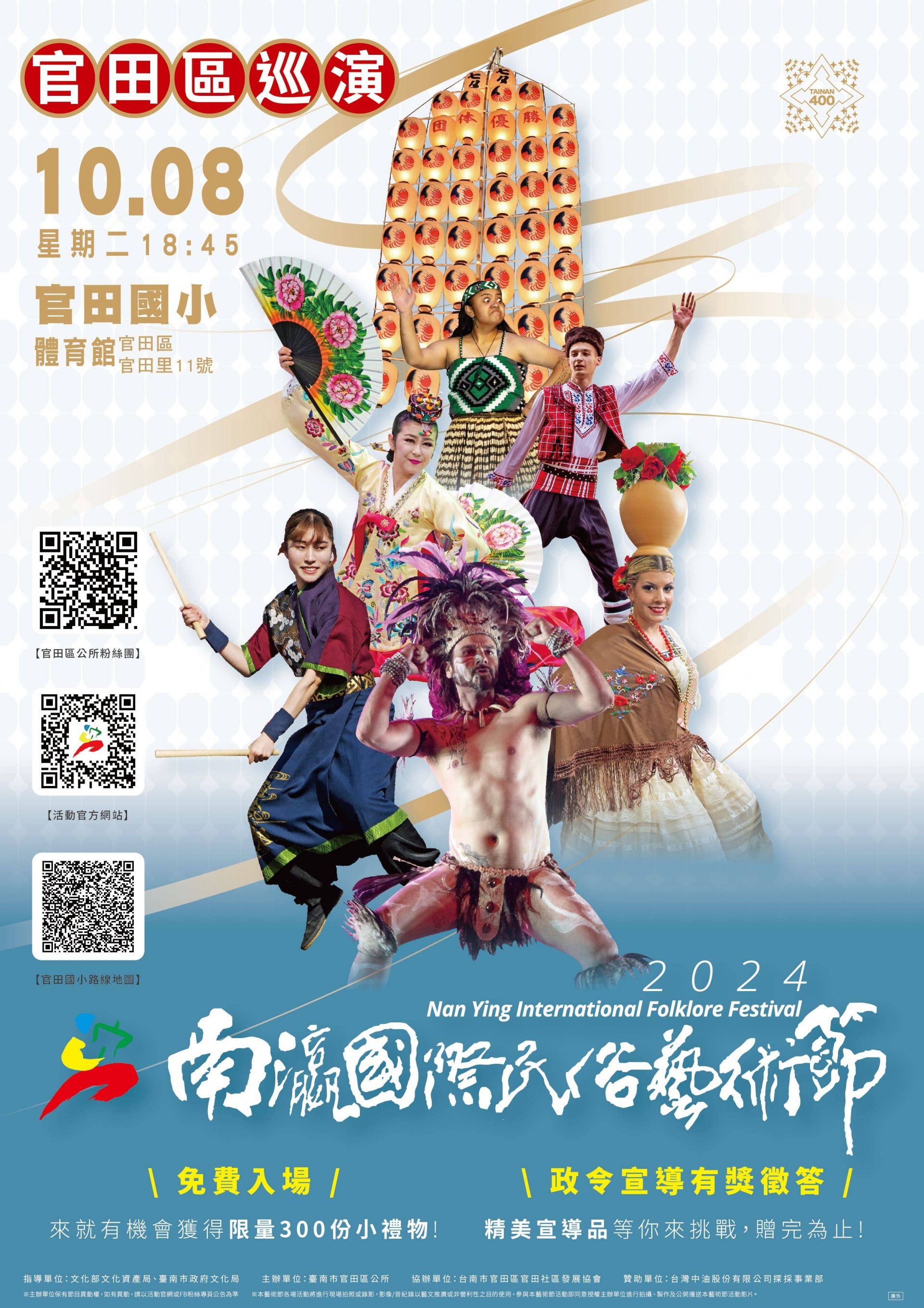 臺南市政府文化局策劃「2024南瀛國際民俗藝術節」活動訂於113年10月08日(星期二)晚上6時45分假本區官田國小體育館巡演,歡迎踴躍參與。
