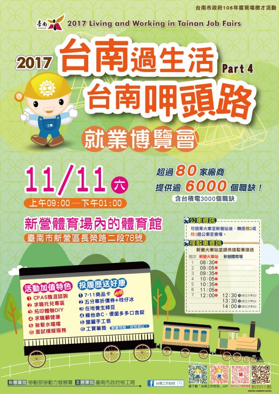 一、臺南市政府勞工局職訓就服中心將於106年11月11日(六)假新營區體育場內的體育館辦理2017台南過生活 台南呷頭路」Part4就業博覽會活動,惠請貴單位依下列自有管道協助宣傳(若無該管道則免),以利求職民眾知悉。
