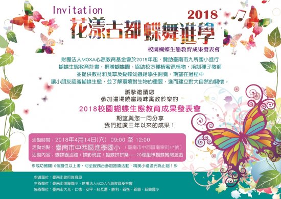 主旨:檢送本校辦理「2018花漾古都 蝶舞進學--校園蝴蝶生態教育成果發表會」活動訊息,惠請協助宣傳,敬邀貴校師生及家長一同參與,請查照。