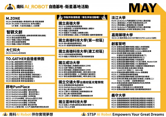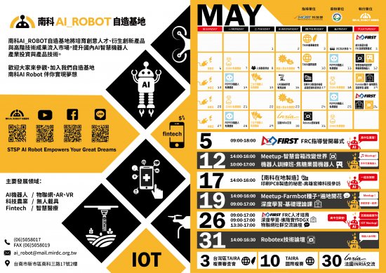 二、檢附「南科AI_ROBOT自造基地」5月活動DM及官方網站、Facebook社團、Line社團加入連結(附件一、二),敬請協助宣傳。