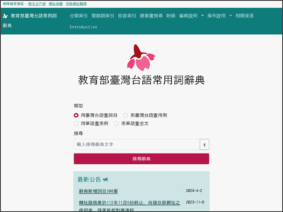 提供臺灣台語搜尋及華語搜尋,可聆聽詞目和例句發音,方便學習。附有分類索引、部首筆劃索引及附錄。