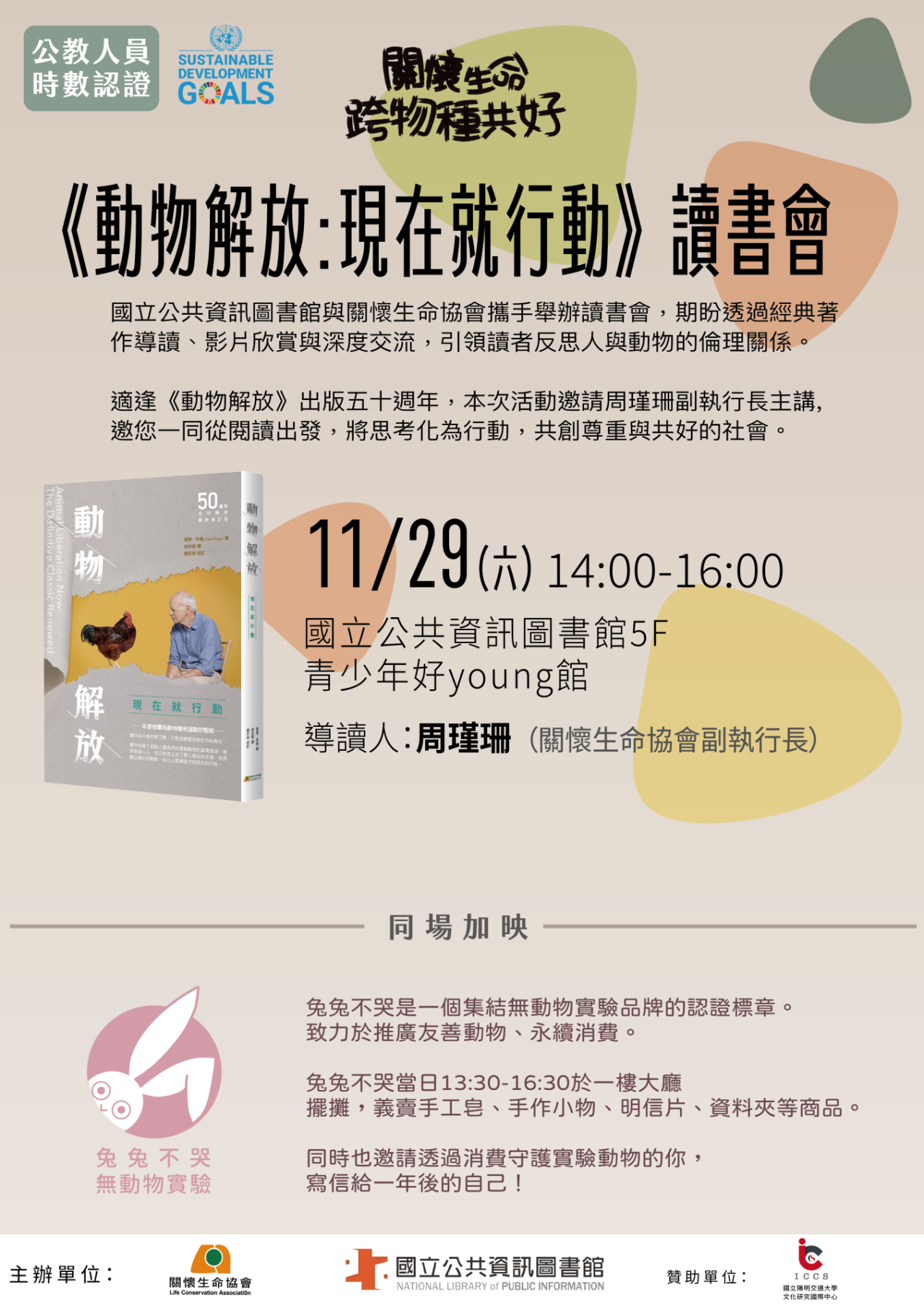 (六)活動形式:議題分享、短片欣賞、主題導讀、深度討 論,另有場外「兔兔不哭」公益擺攤(國立公共資訊圖書館總館 1 樓 13:30-16:30 ),推廣無動物實 驗產品、讀者互動。↵