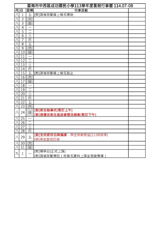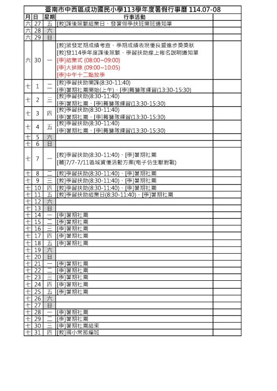 114年成功國小暑期行事曆