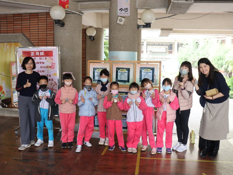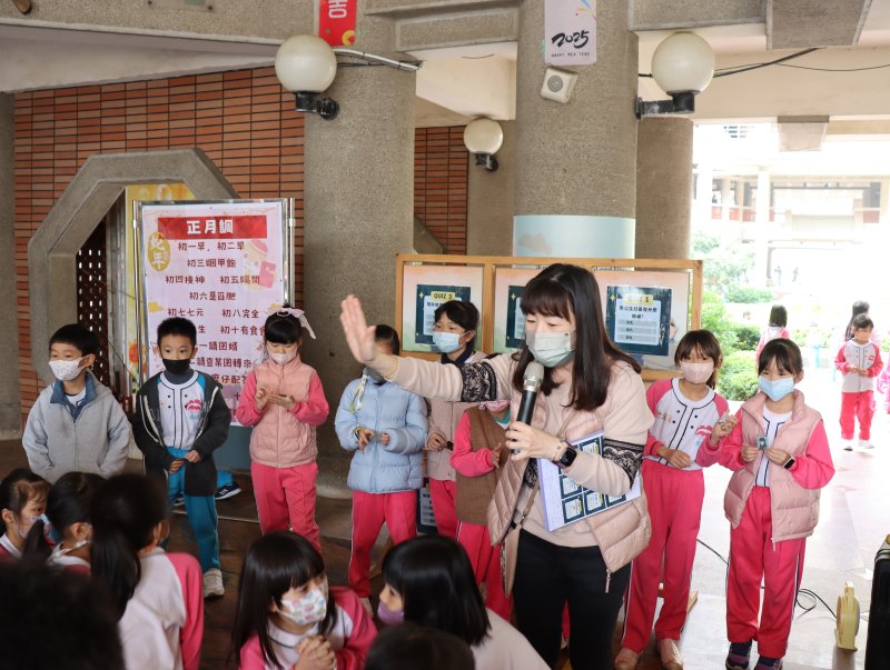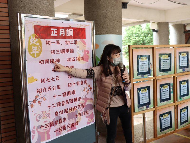 介紹過年正月調,透過正月調的猜謎活動,引發學生對母語俗艷的好奇心與學習興趣,猜謎答對的同學頒發動漫人物磁鐵,獎勵積極參與學生。