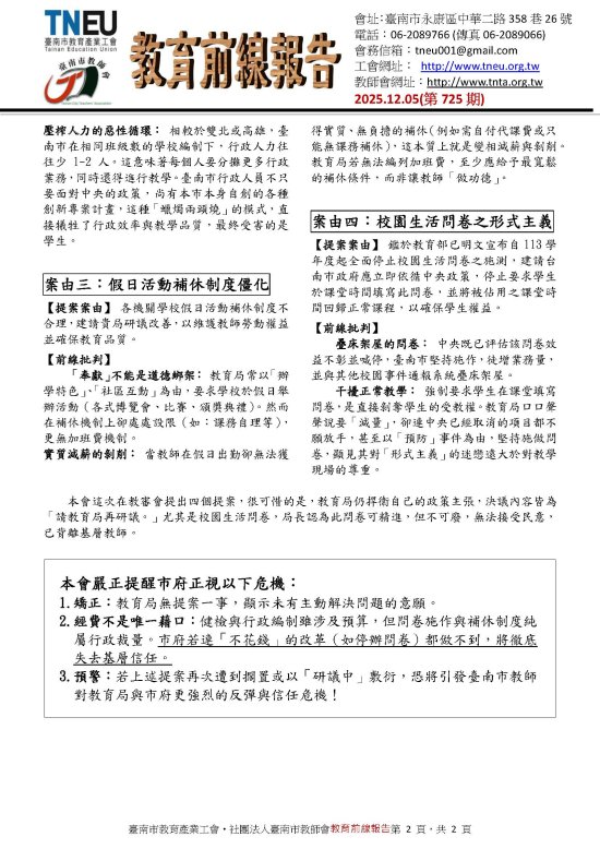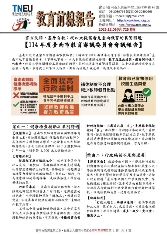 官方失語,基層自救:從四大提案看見臺南教育的真實困境 【114 年度臺南市教育審議委員會會議報告】 臺南市教育產業工會與臺南市教師會(下稱本會)昨日由理事長陳葦芸、秘書長黃銀姝出席「臺南市教育審議委員會」(下稱教審會),本次會議我們遺憾地發現,教育局並無提案,僅有例行性工作報告。教育主管機關對於基層面臨的過勞、差別待遇及行政繁瑣等問題,似乎仍與現場感受存在落差。為此,本會提出以下四大訴求,期盼局端能正視危機,展現改革的決心。