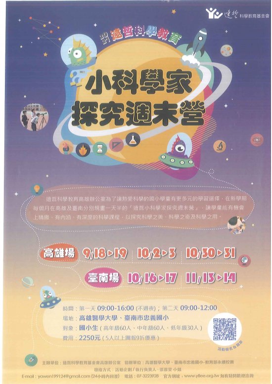 高雄場10/2-3、10/30-31 台南場10/16-17、11/13-14 有興趣的小朋友可至學務處領取簡章 主辦單位:遠哲科學教育基金會高雄辦公室