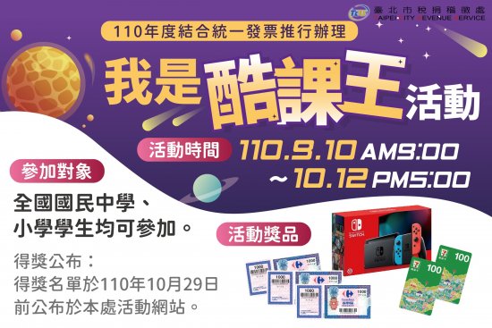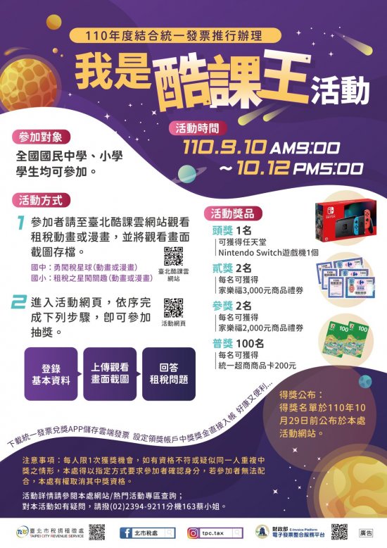 二、 活動內容:全國國中、國小學生於活動期間至臺北酷課雲網站之臺北市金融理財教育─租稅教育專區內觀看租稅教育漫畫或動畫等任務,並至本處活動網頁完成租稅問題,就有機會獲得 Nintendo Switch 、家樂福禮券或統一超商品卡等好禮,獎項多達 105 個。