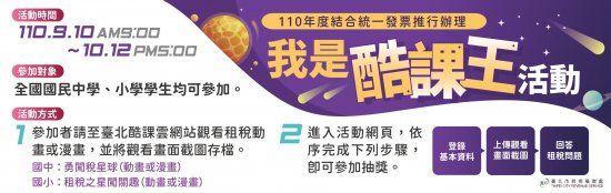 為使國中、國小學生瞭解國稅與地方稅常識及稅政,本處舉辦「我是酷課王」線上閱讀抽獎活動如說明,檢送活動內容海報及橫幅電子檔,請協助於貴機關網站、 FB 粉絲專頁、 LINE 群組及其他管道進行宣傳。
