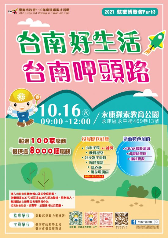 2021「台南好生活 台南呷頭路」Part3 就業博覽會,將在 10 月 16 日(週六)上午 9 時於永康區探索教育公園辦理,當日超過 100 家廠商,提供逾 8000 個工作機會;活動當天有「投履歷送好康」、「CPAS 職涯諮詢」及「面試模擬」等多項免費服務,詳洽: 06-6330820 。