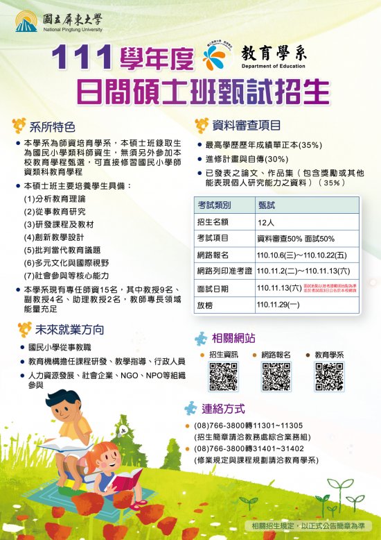 六、洽詢電話:該校教育學系 08-7663800 分機 31401 、 31402 。
