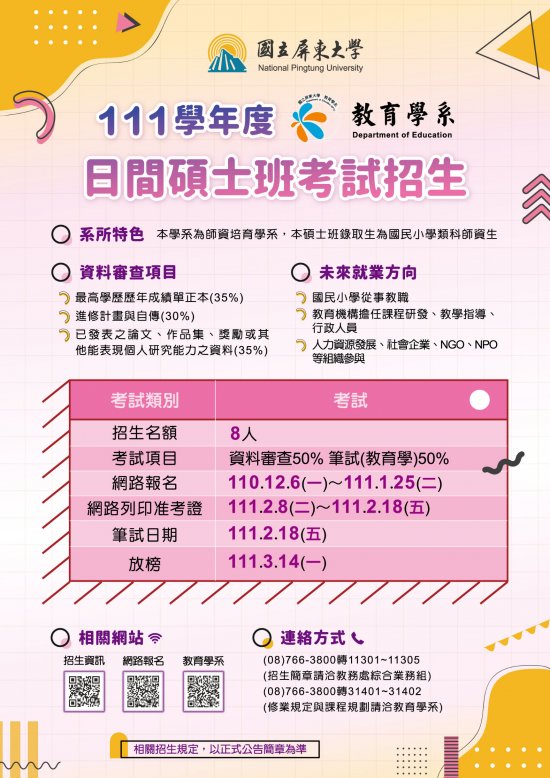 六、洽詢電話:該校教育學系 08-7663800 分機 31401 、 31402 。