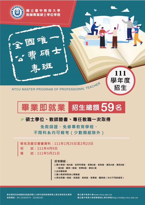 一、該校教師專業碩士學位學程為碩士公費師資專班,教師證書、專任教職、碩士學位一次取得,歡迎有志投入偏鄉教育志業的學子及代理代課教師報考。
