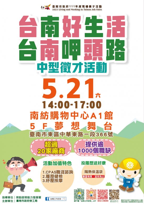 2022「台南好生活 台南呷頭路」第 2 場中型徵才,將在 5 月 21 日(週六)下午 2 時於東區南紡購物中心辦理,當日有超過 20 家廠商,提供逾 1,000 個工作機會;現場還有投履歷送好康、 CPAS 職涯諮詢及履歷健檢等服務,詳洽: 06-6330820 。