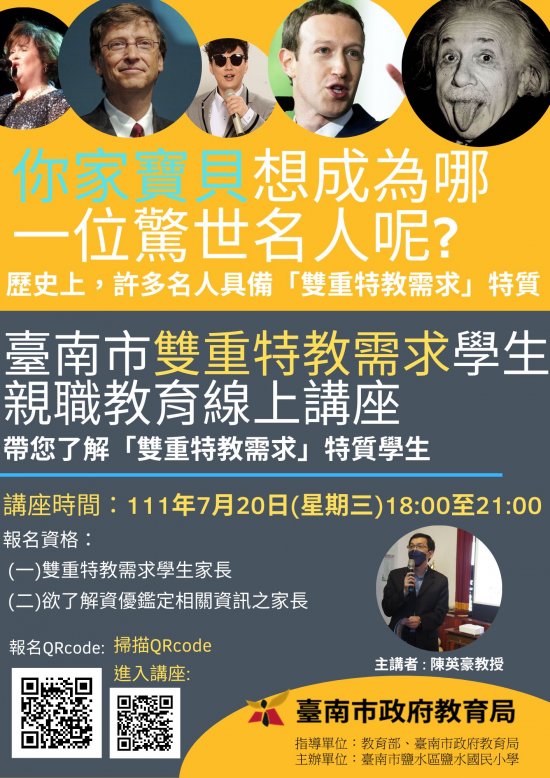 二、原訂 111 年 7 月 2 日之雙殊生親職線上講座,因故改於 7 月 20 日(星期三)下午 6 時至 9 時進行,請各校務必轉知家長本公告。