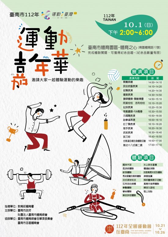 說明: 一、依據社團法人臺南市體育總會 112 年 9 月 15 日南市體總四字第 1120010930 號函辦理。 二、活動時間及地點: (一)時間: 112 年 10 月 1 日(星期日)下午 2 時至 6 時。 (二)地點:臺南市立體育場—體育之心。 三、檢附活動海報 1 份供參。 四、本案倘有相關問題請逕洽社團法人臺南市體育總會陳淑菁主任,聯絡電話: 06-2155333 。