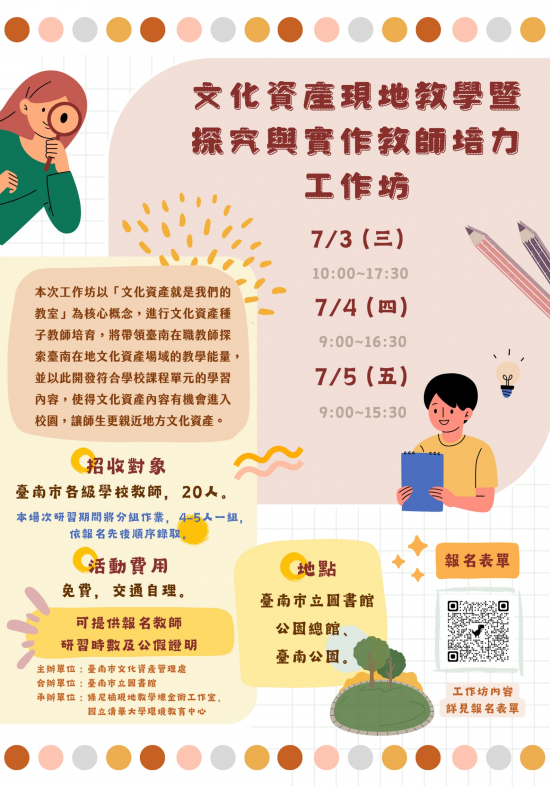 一、本次工作坊配合現行 108 課綱,培養學生的各類核心素養,以「文化資產就是我們的教室」為核心概念,進行文化資產種子教師的培育,將帶領臺南的在職教師探索臺南在地文化資產場域的教學能量,並以此開發符合學校課程單元的學習內容,使文化資產內容有機會進入校園中,讓師生有機會親近地方的文化資產,歡迎本市國小、國中及高中在職教師報名參加。