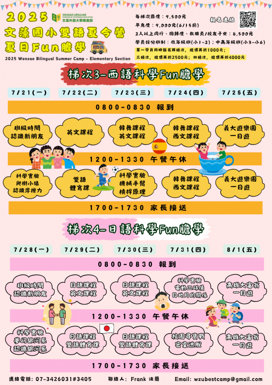 一、時間: 114 年 7 月 7 日(一)至 8 月 1 日(五),上午 8 時至下午 5 時。一週一梯次,共四梯次。↵