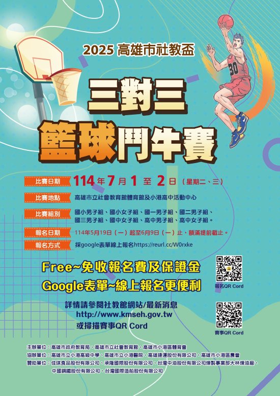 函轉高雄市政府教育局與高雄市立社會教育館合辦之「2025高雄市社教盃三對三籃球鬥牛賽」海報及簡章