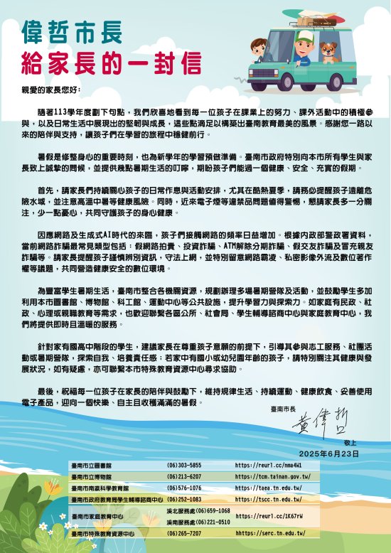 轉知偉哲市長給家長的一封信「偉哲市長給家長的一封信」。