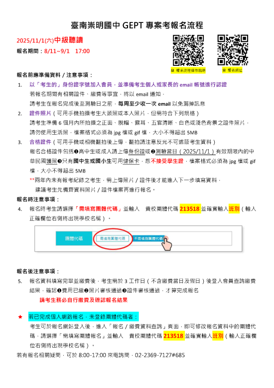 📌 請各位考生務必確認是否已正確輸入團體代碼,以利後續統計及考場安排。