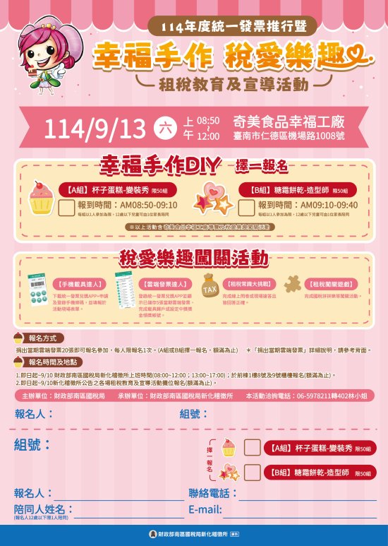 (四)報名方式: 9/10 前上班時間洽財政部南區國稅局新化稽徵所(前棟 1 樓 9 號櫃檯),電話: 06-5978211 分機 402 ,林小姐。
