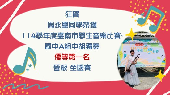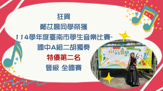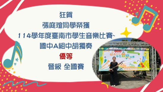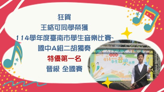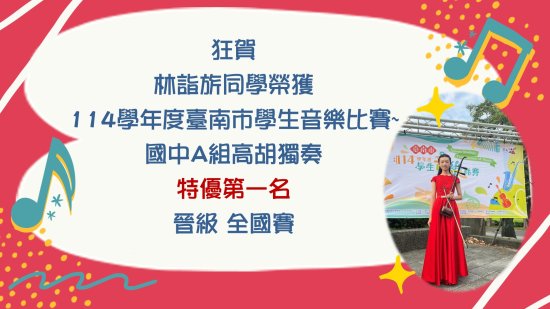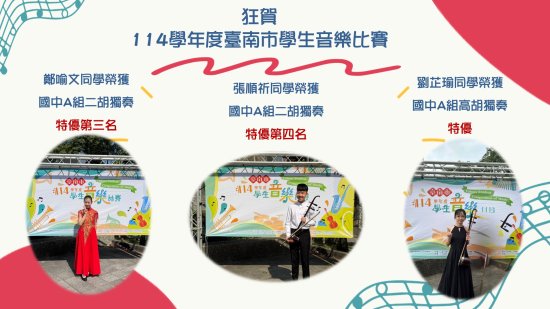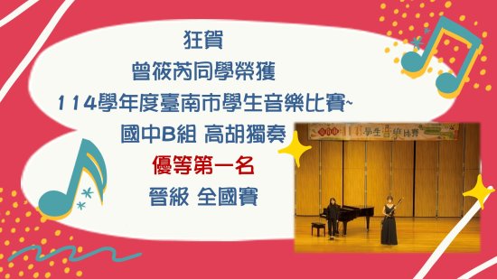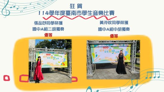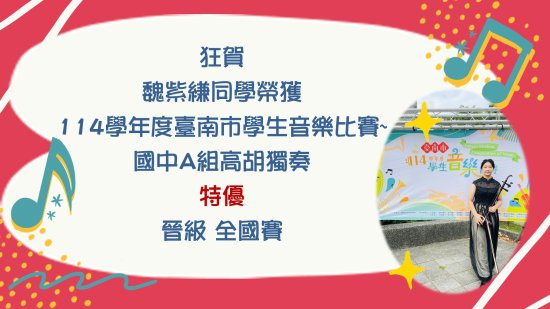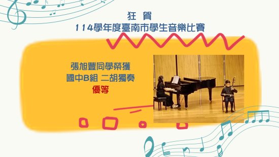 狂賀!本校同學參加114學年度臺南市學生音樂比賽個人賽(拉弦類)表現卓越再創佳績。 (蕭雅黛)