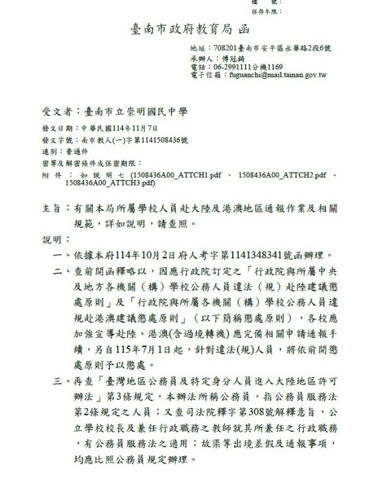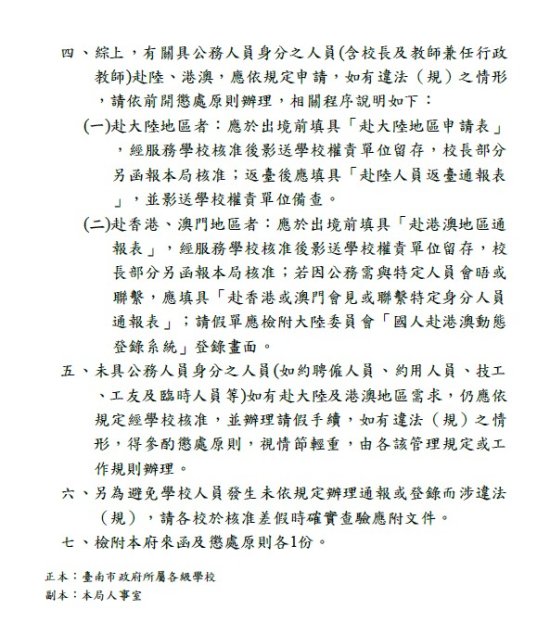 重要公告:有關本局所屬學校人員赴大陸及港澳地區通報作業及相關規範。 (許尤薇)