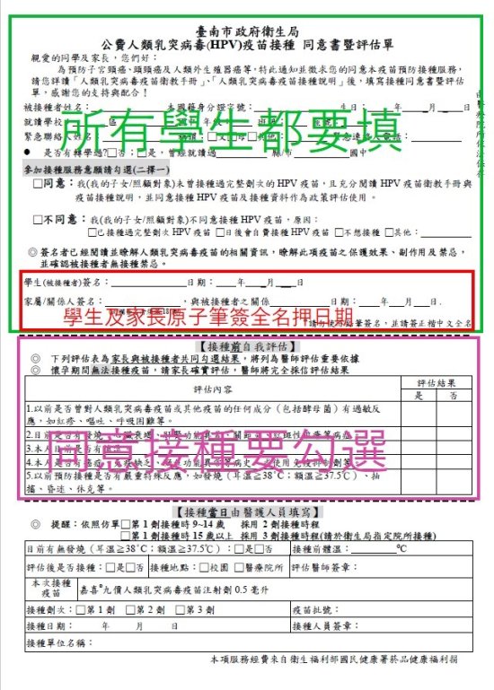 本學期訂於 3/20 星期五由合約院所入校接種 HPV 疫苗,相關資訊及同意書填寫範例請參考以下內容,同意書於今日發放,並請您於2/25 前完成同意書填寫及簽名後繳回給導師。