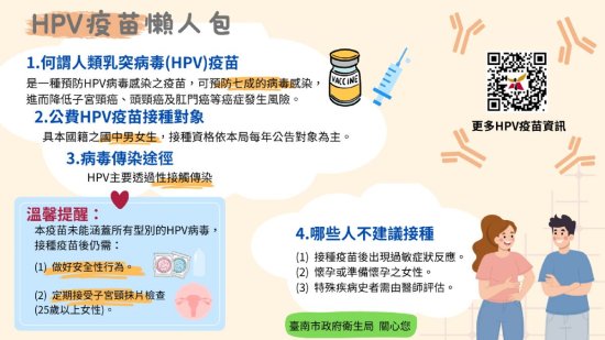 臺南市政府衛生局 HPV 疫苗專區 https://health.tainan.gov.tw/list.asp?orcaid=ED46D13B-4DA1-4963-81AC-E058E3C9B29E