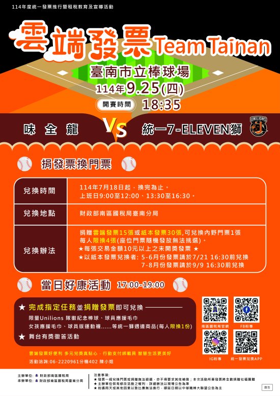 一、本次活動藉由觀看職業棒球比賽辦理租稅宣導,以捐贈發票方式兌換臺南巿立棒球場內野門票(味全龍 VS 統一 7-ELEVEN 獅),門票兌換時間自 114 年 7 月 18 日起(上班日 9:00 至 12:00 、 13:30 至 16:30),換完為止。