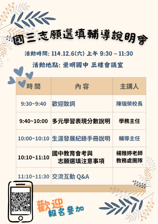 由學校行政團隊說明講解,歡迎家長前來了解國中教育會考與志願選填注意事項,幫助孩子設立目標、適性選擇。