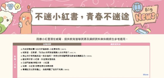 教育部建置「不迷小紅書,青春不迷途」專區,提供小紅書潛在威脅教育宣導資源及講師資料,連結專區(https://eliteracy.edu.tw/Shorts/xiaohongshu.html),鼓勵親師生參考運用。