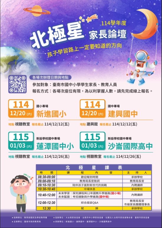 二、為提升本市家長了解國教總綱及最新教育趨勢之認知與理解,進而成為各校推動課程與教學的助力,本局與大台南家長協會、台南市中小學家長協會、社團法人台南市家長會聯合會、臺南市家長協會共同辦理 4 場次總綱宣講辦理旨案活動,擴大宣導效益。