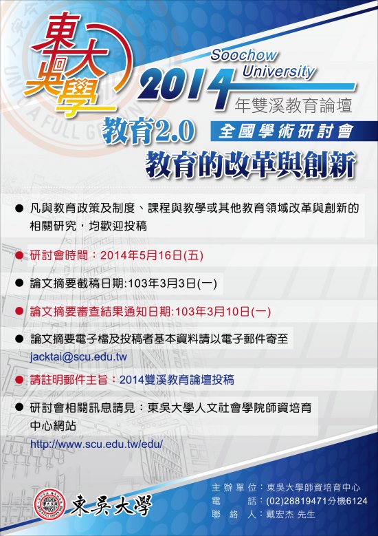 一、 2014 年雙溪教育論壇全國學術研討會訂於 103 年 5 月 16 日(星期五)舉辦,研討主題為「教育 2.0-教育的改革與創新」,凡與教育政策及制度、課程與教學或其他教育領域改革與創新的相關研究,均歡迎投稿。