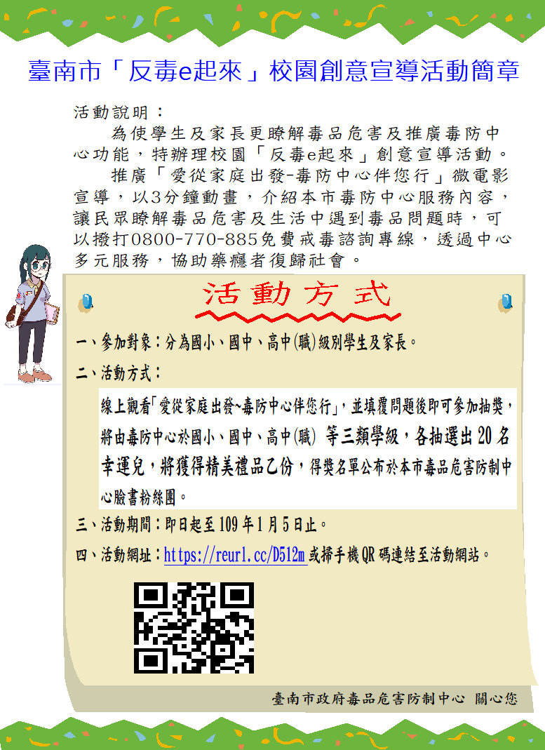 (三)活動方式:本市「反毒e起來」校園創意宣導活動,請邀請每位學生及家長參加「反毒e起來」創意宣導活動,於線上觀看「愛從家庭出發~毒防中心伴您行」,並填寫觀看心得後即可完成,由本市毒品危害防制中心於國小、國中、高中(職)等三類學級,各抽選出20名幸運兒,將獲得精美禮品乙份,得獎名單公布於本市毒品危害防制中心臉書粉絲團。