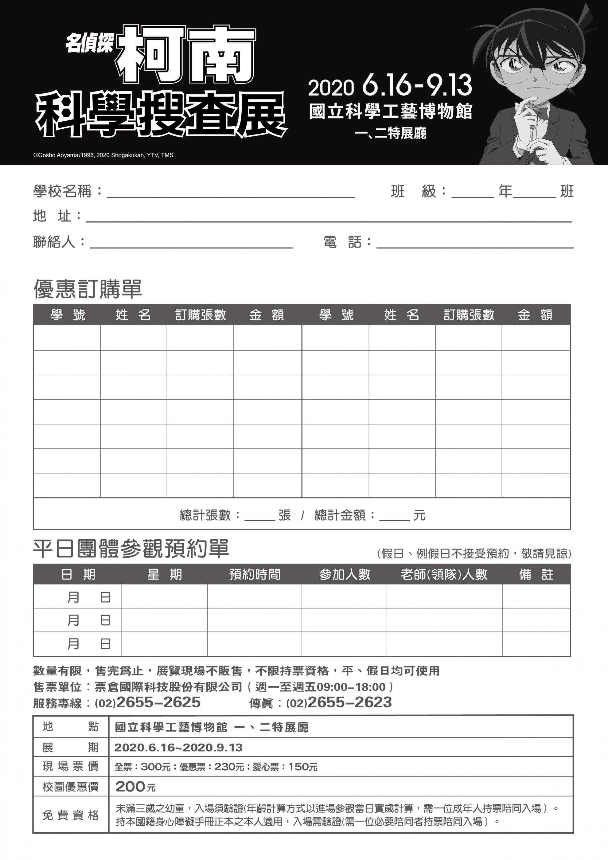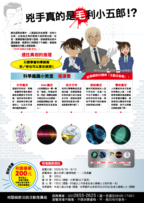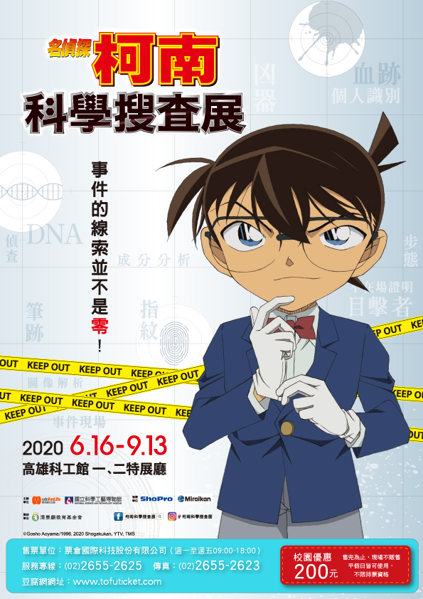 二、「名偵探柯南 科學搜查展」 (高雄場)展覽訊息如下:(一)展覽時間: 109 年 6 月 16 日(二)至 9 月 13 日(日),每日 09 : 00~17 : 00 (無休館)。