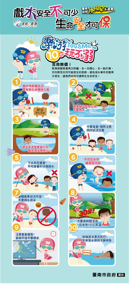 二、請務必至有配置救生員之水域戲水,並強調「多一分準備,少一分遺憾」。相關資料查詢請至「學生水域運動安全網」(http://www.sports.url.tw)及「決定命運 4 招」宣導短片(https://www.youtube.com/watch?v=_Ho8ygc3oxs&t=39s&pbjreload=10)。