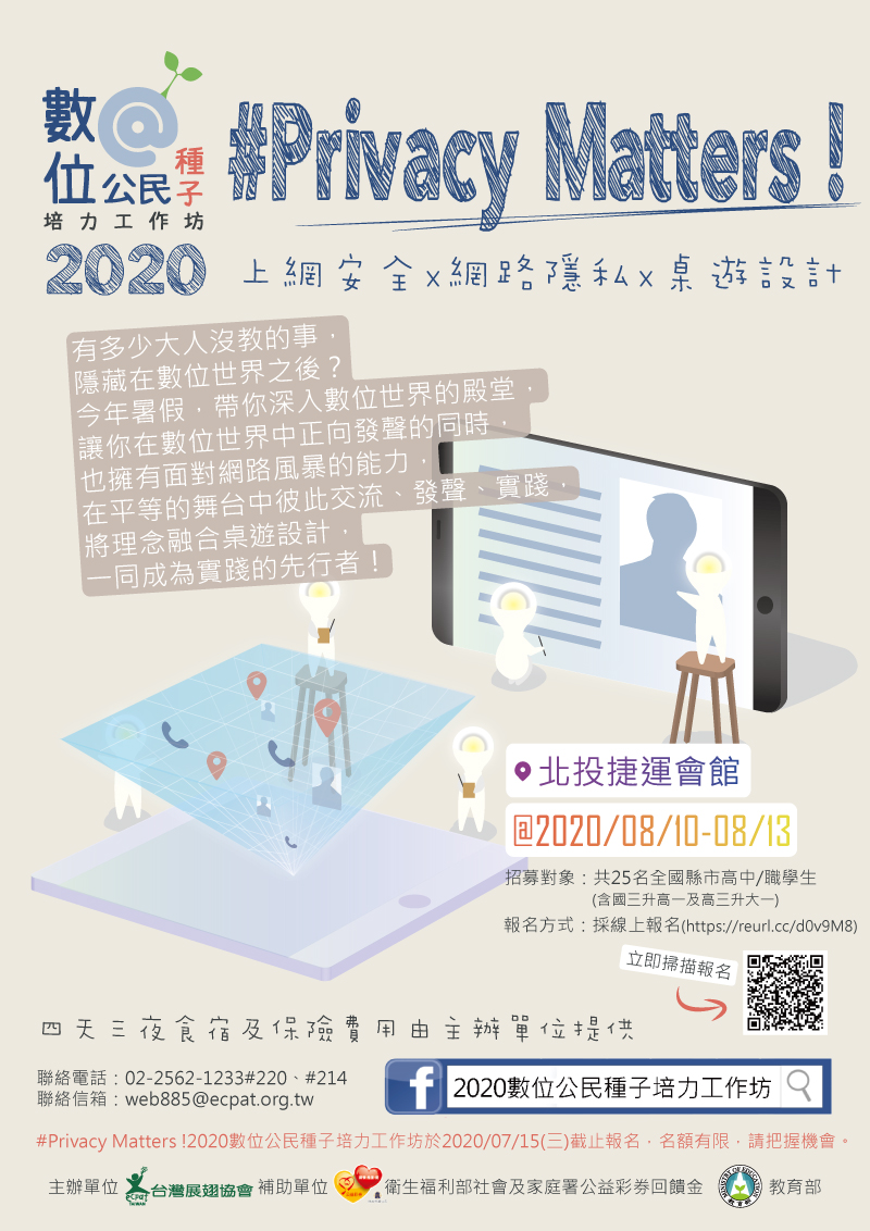 一、兒少不只是網路世界的使用者,同時也擔任了參與者與產出者,兒少的想法應受到重視,為讓兒少了解網路有多樣面貌,並增進兒少數位公民、上網安全意識,成為積極的網路行動者,本會於 2020 年 8 月 10-13 日舉辦數位公民種子培力工作坊,工作坊中緊扣著網路「隱私權」為主題,邀請政府、業者、 NGO 、專家學者們透過專題講座、場次交流、小組合作以及開放空間討論等方式增強、實踐兒少在數位世界中的行動力和影響力,一起在工作坊產出一個緊扣著主題的桌遊成品,並具體發揮兒少影響力,推動與實踐數位公民意識,讓兒少相互影響,推己及人,提升兒少對網路公共事務的參與。