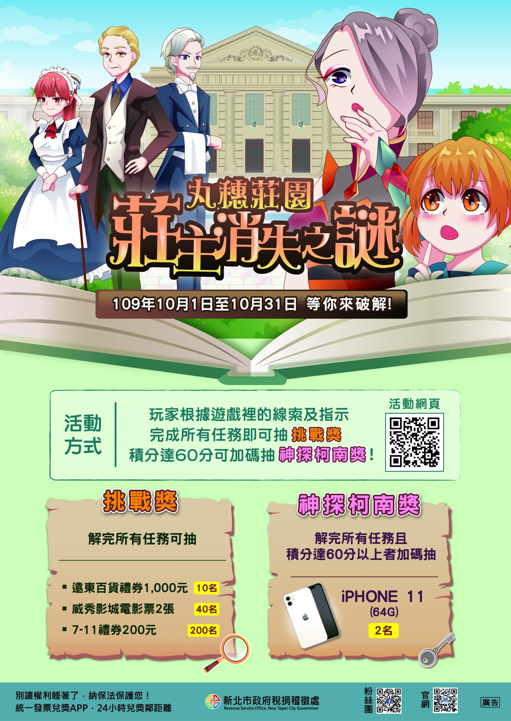 主旨:台北稅捐稽徵處舉辦「丸穗莊園莊主消失之謎」網路互動式遊戲抽獎活動,活動期間自 109 年 10 月 1 日至 109 年 10 月 31 日止,請協助將活動訊息放置於所屬官網、 FB 及其他宣傳管道,並請鼓勵師生及家長踴躍參加,請查照。 說明: 一、玩家根據遊戲裡的線索及指示破解所有任務即可抽挑戰獎,獎項有遠東百貨禮券 1,000 元、威秀影城電影票 2 張及 7-11 禮券 200 元,若遊戲積分超過 60 分者,還可加碼再抽神探柯南獎 iPHONE 11!詳情請參閱本處 FB「稅不著-呼叫暗光鳥」或活動網站 (https://www.avsa.me/109ntpctax 。