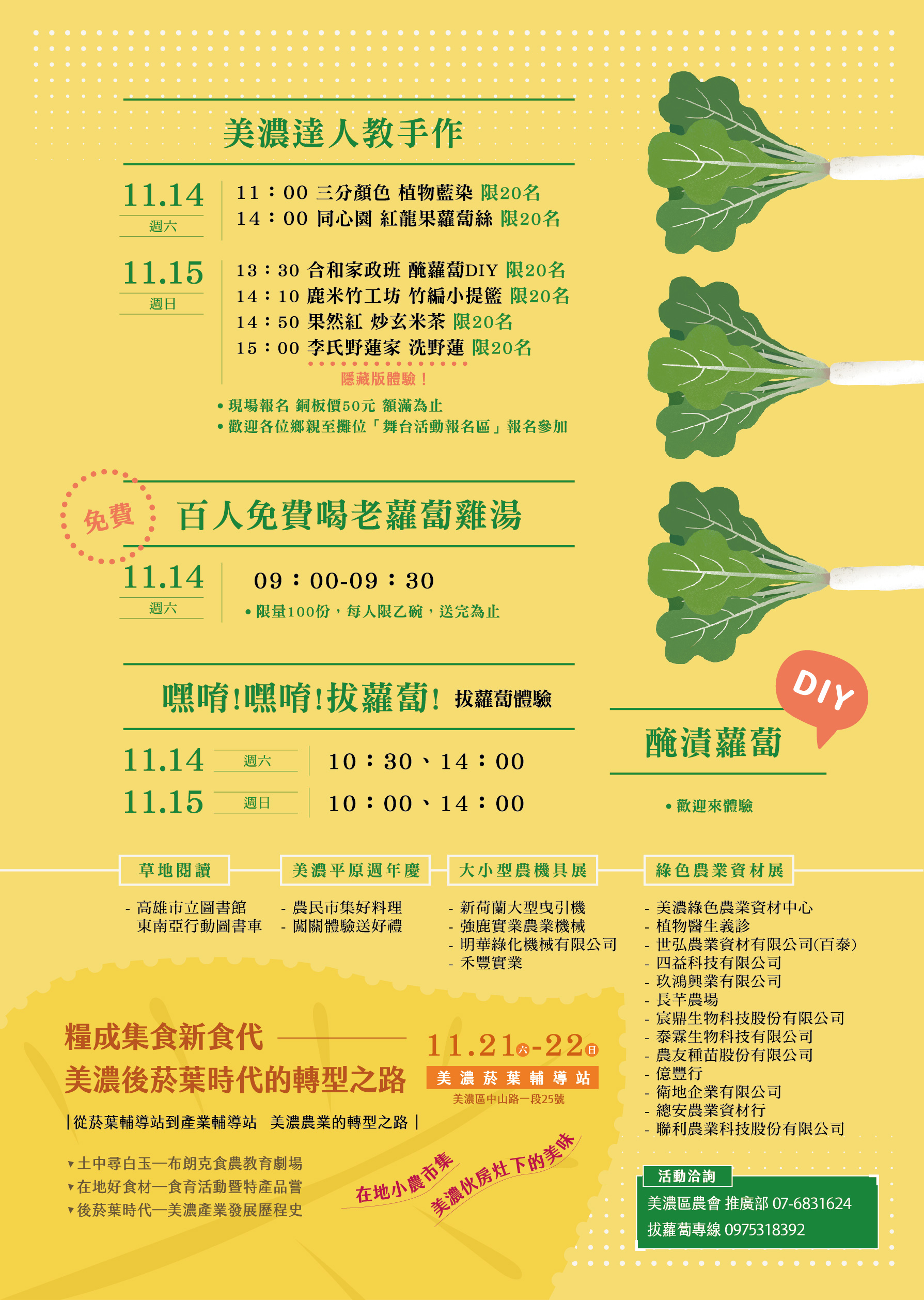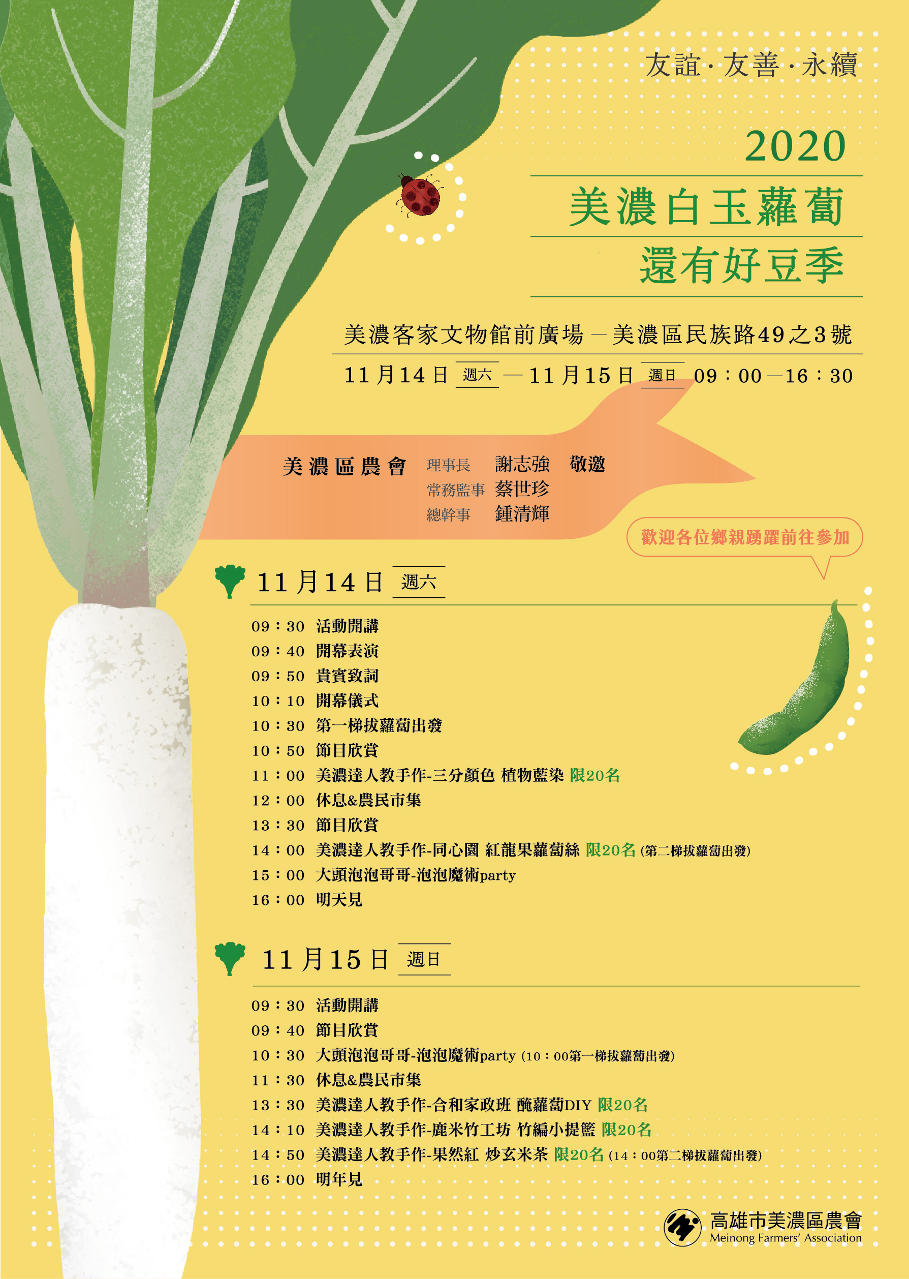 11 月 14 、 15 日(星期六、日)假美濃客家文物館前廣場(地址:高雄市美濃區民族路 43 之 3 號)舉辦「2020 美濃白玉蘿蔔還有好豆季」活動