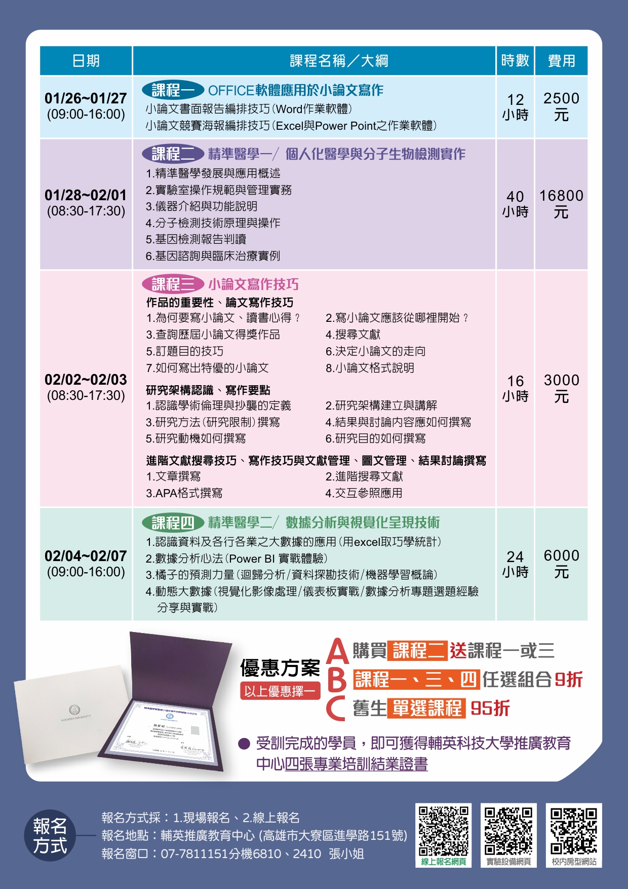 一、輔英科技大學 109 學年度第一學期推廣教育中心訂於 110 年 1 月 26 日至 110 年 2 月 7 日辦理「小論文寫作寒令營系列課程」,開課資訊詳如簡章說明,即日起開始報名。